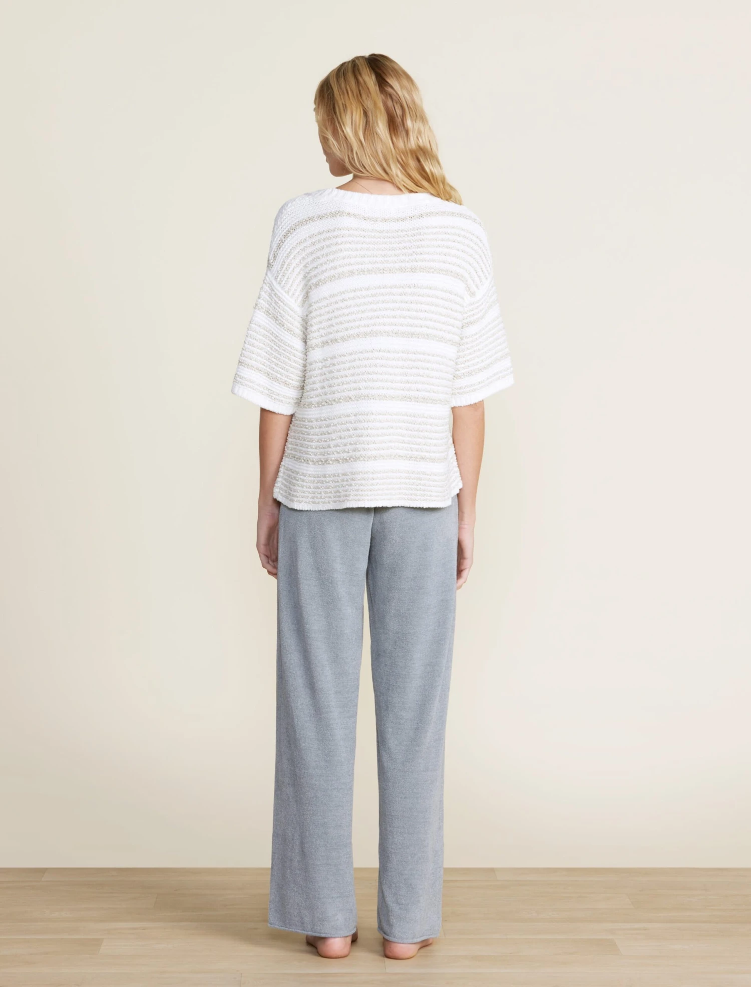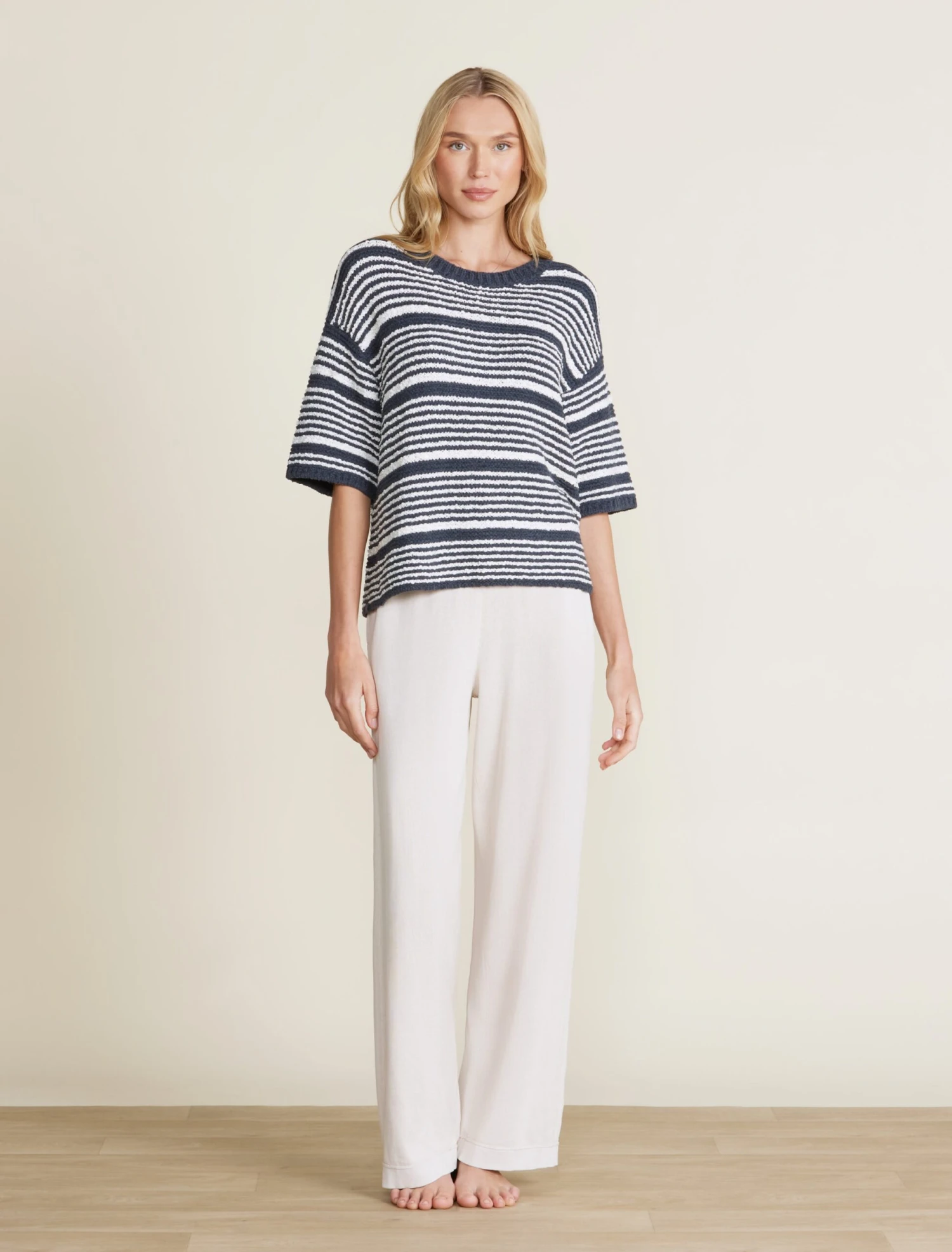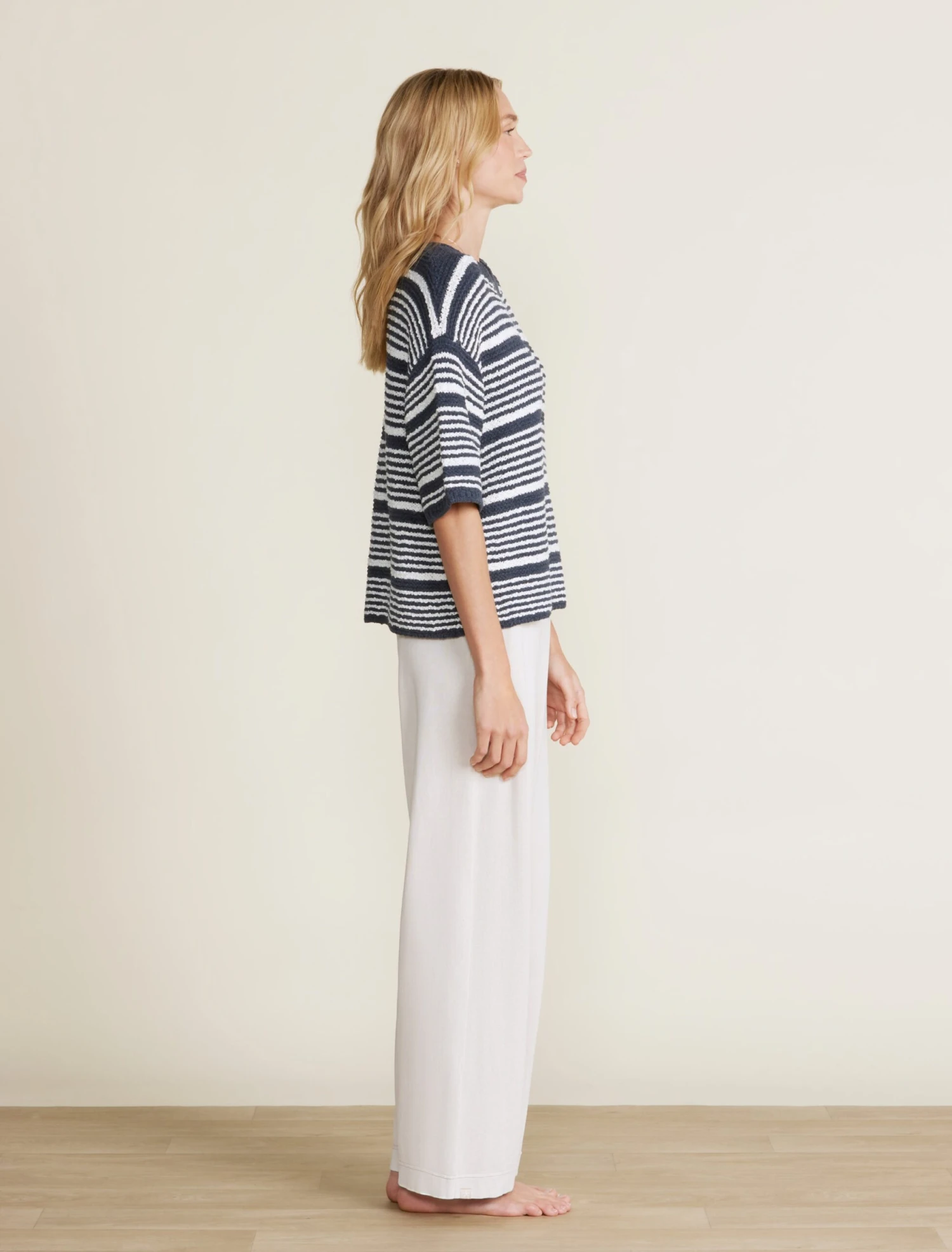 Our Boucle Striped Pullover offers a sophisticated look in two color variegated stripes. The boxy fit and drop shoulder short sleeve helps achieve a balanced style that hits just below the waist. Crafted with a blend of Boucle and CozyChic Ultra Lite fabrics, this top is sure to be a stylish addition to any wardrobe. Models are between 5’9″ and 5’11” and wearing a size Small.
