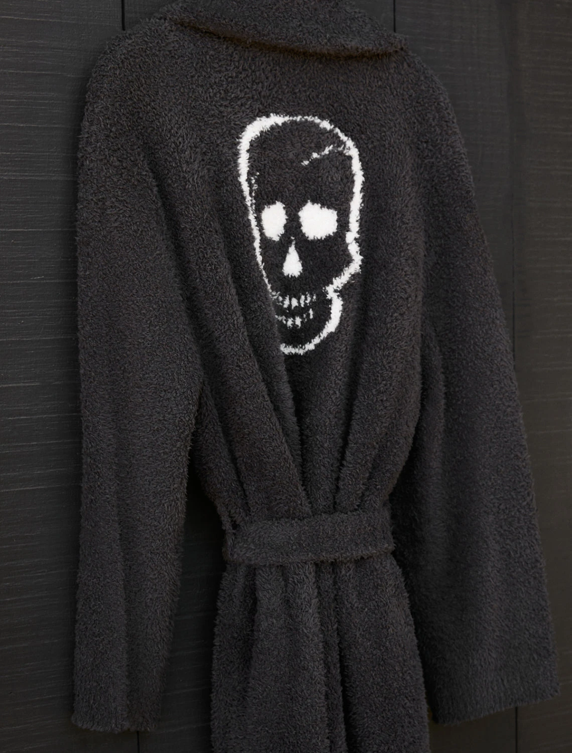 Our signature plush robe gets an edgy update with this cozy yet cool two tone skull design. This unisex style features a doubled shawl collar, front patch pockets and adjustable tie at waist.